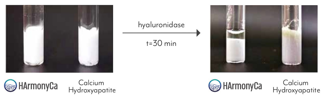 Como no HarmonyCa® as esferas de hidroxiapatita estão envoltas com ácido hialuronico, e não possui glicerol em sua composição, este tem uma osmolaridade muito próxima do tecido, ou seja, não há ardor após a aplicação, sendo semelhante a um preenchedor de ácido hialurônico.