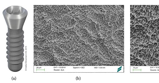 A macrorrugosidade da superfície SLA (Sandblasted, Large grit, Acid-etched) é criada por jateamento de areia com partículas de corindo de 0,25–0,5 mm a 5 bar. A estrutura microtopográfica da superfície resulta de um subsequente processo de tratamento ácido com HCl/H2SO4 em altas temperaturas, gerando uma área de superfície ativa com rugosidade uniforme e adesão celular aprimorada. A superfície Promote da Camlog segue uma abordagem comparável, com um valor de 𝑆𝑎 de 1,3 μm e topografia de superfície microrrugosa.