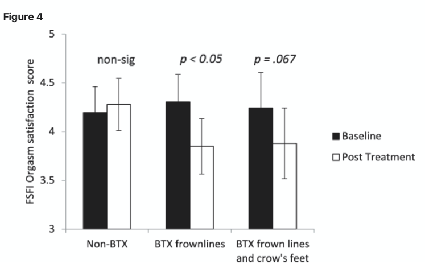 O estudo também sugere que a redução da capacidade de fazer expressões faciais associadas ao prazer sexual leva a uma redução na sensação relatada de prazer, visto que as participantes relataram maior dificuldade de chegar ao orgasmo após o tratamento, como mostrado no quadro (7):