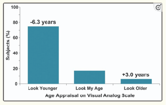 FACE-Q Avaliação de Idade: efeito substancial. 75% dos pacientes relataram que aparentam em média 6,3 anos a menos, 17% aparentam a idade real e 6% apenas relataram que aparentavam em média 3 anos mais velhos ao final do estudo (5).