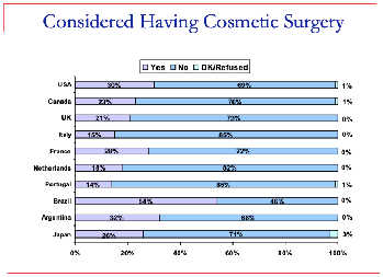 50% das brasileiras relataram que consideraram realizar procedimentos estéticos e 7% reportaram já ter realizado algum tipo de cirurgia estética, a maior porcentagem dentre todos os dez países estudados, como mostra o gráfico (18):