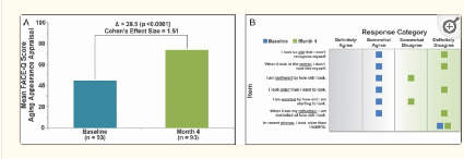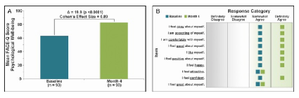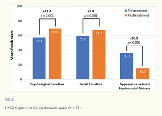 Uma avaliação prospectiva de pacientes que se apresentaram pela primeira vez para realizar esse tipo de tratamento com injetáveis faciais (Juvederm, Vycross e Botox, todos produtos da Allergan) teve por objetivo medir esse impacto usando o método validado de escalas FACE-Q. 35 participantes, dos quais 32 eram mulheres de idade média de 45 anos, responderam a 3 escalas antes e 2 semanas após a realização dos procedimentos, sendo elas sobre: Função Psicológica (como a pessoa se sente: positiva, confortável, autoaceitação, etc.), Função Social (nível de autoconfiança e conforto ao conhecer novas pessoas e em situações sociais) e sofrimento psicossocial relacionado à aparência (nível de infelicidade e estresse sobre sua aparência, preocupações sobre se sentir feia, anormal, e evitação social). Foram encontrados resultados de melhoria significantes nas 3 escalas usadas, conforme gráfico a seguir (10):