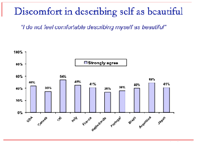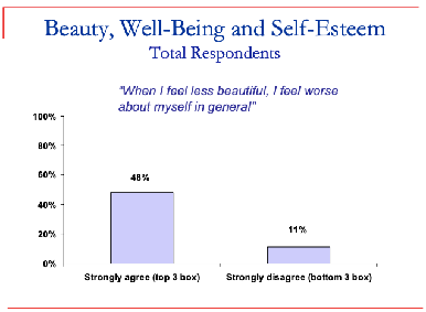 Um estudo encomendado pela Dove (Unilever) em 2004, em colaboração com a medicina de Harvard e a Escola de Economia de Londres, teve como intuito identificar o significado de “beleza” entre as mulheres globalmente, e realizou uma revisão da literatura em 118 países em 22 línguas, além de entrevistar 3.200 mulheres de 10 países (EUA, Canadá, Grã-Bretanha, Itália, França, Portugal, Holanda, Japão, Brasil e Argentina). Segundo os autores, 68% das mulheres julgaram, há 20 anos, que os padrões de beleza estabelecidos socialmente nunca seriam atingidos, contudo declararam esforçar-se para alcançá-los. 48% dessas mulheres apresentaram níveis de baixa autoestima relacionados ao conceito de beleza (18).