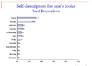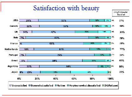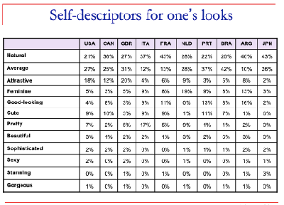 É de extrema importância comparar esses dados com dados de estudos em que as mulheres se enxergam acima da média quanto à inteligência, maternidade e sobre suas capacidades como esposas, funcionárias ou motoristas; daí percebe-se que “média” é um valor excepcionalmente baixo de autoavaliação. Na verdade, o estudo mostra que as mulheres estão menos satisfeitas com sua beleza do que com quase todas as outras dimensões da vida. 75% das mulheres no estudo gostariam de ver mais diversidade nas imagens de beleza (18).