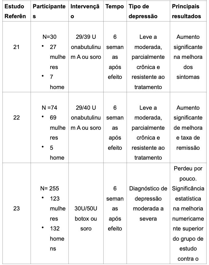 Logo, vários estudos confirmaram o efeito antidepressivo da toxina botulínica na glabela. Apesar de o número de estudos ainda ser pequeno, existe um alto nível de evidência de sua eficácia como tratamento para depressão em mulheres com depressão leve a moderada. A segurança e a tolerabilidade do tratamento foram excelentes em todos os estudos (19).