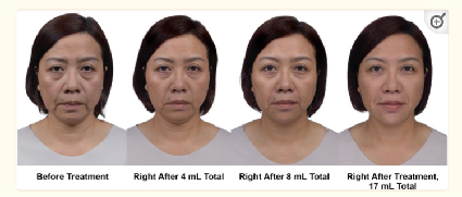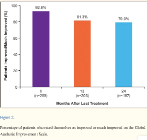 Um estudo com 282 participantes, sendo 189 mulheres e 46 homens, com idade entre 35 e 65 anos e perda de volume facial de moderada a severa, avaliou o uso do preenchedor Juvederm Voluma XC. Os pacientes foram randomizados para receber em média 6,68 ml de Juvederm (n=235) ou para serem do grupo controle sem tratamento (n=47). Os autores acompanharam trimestralmente os resultados durante 2 anos, utilizando a Escala Global de Melhoria Estética (GAIS) e as imagens do VECTRA 3D, avaliando a satisfação geral com a aparência facial e a autopercepção de idade. Após 6 meses e 2 anos do tratamento, os pacientes relataram, em média, uma aparência 5 anos mais jovem após 6 meses e 3 anos mais jovem após 2 anos, e grande melhora da aparência facial, conforme mostrado nos gráficos abaixo (25):