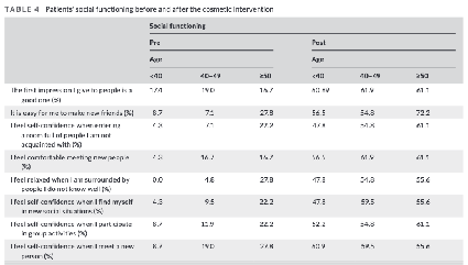 De maneira geral, os resultados demonstram que os pacientes demonstraram benefícios psicológicos e sociais significativos do tratamento, além de melhorias consideráveis na autopercepção de aparência e de idade; experimentaram melhorias sentindo-se mais positivos, confiantes e felizes com sua aparência facial e confortáveis, confiantes e positivos em suas interações sociais. Curiosamente, o fato de que nem todos os pacientes relataram parecer mais jovens após os procedimentos neste estudo pode indicar que eles procuraram parecer melhor, mas não necessariamente mais jovens (5). Fato que deveria ser evidenciado por nós como profissionais, no combate ao etarismo.