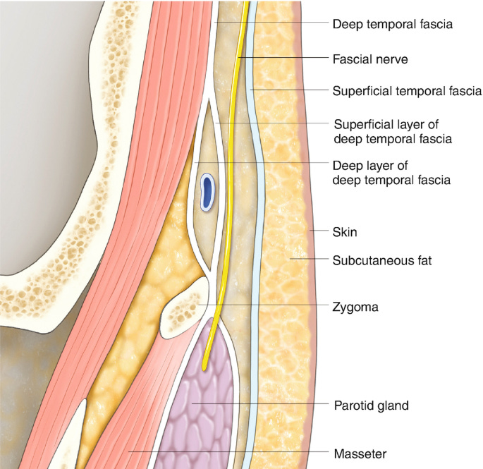 Um marco importante na região temporal é a artéria temporal superficial que pode ser facilmente palpada ao longo da linha do cabelo - a veia segue na mesma direção. O ramo frontal do nervo facial, que inerva o músculo frontal, o orbicular do olho e o corrugador superciliar, fica na gordura intermediária interposta entre a extensão suprazigomática do SMAS abaixo e as camadas profunda e superficial da fáscia temporal (ou fáscia temporal profunda). O nervo percorre uma linha imaginária que conecta a base do tragus a um ponto 1,5 cm acima da sobrancelha.