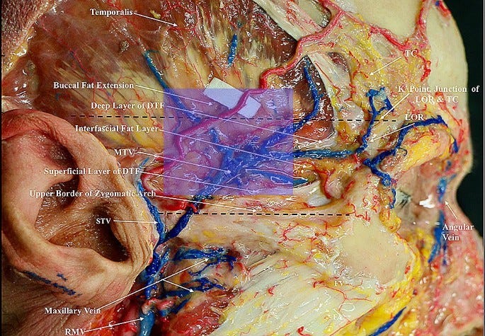 Abaixo desta encontramos outra camada de gordura, o compartimento buco temporal, e, finalmente, a fáscia do músculo temporal.