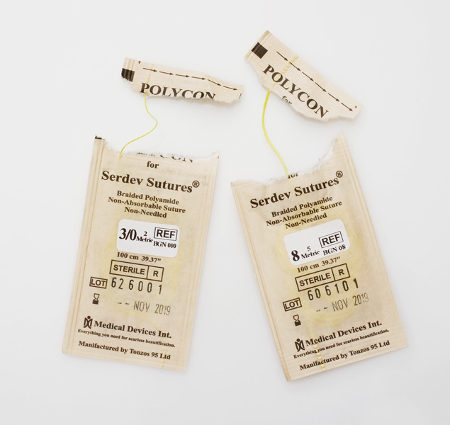 Suturas Polycon Serdev®, com características de elasticidade interessante para o lifting temporal.