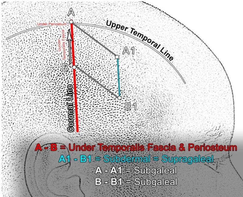 1. Inicia-se com anestesia e faz-se uma incisão A-B de 2-3 cm ao longo da linha coronal. 2. A pele e a gordura subdérmica são abertas, revelando a gálea vascularizada vermelha abaixo. 3. Após a abertura da gálea com um instrumento mosquito, a fáscia temporal, com aspecto branco e brilhante é exposto 4. Segue-se uma dissecção subgaleal romba até a linha do cabelo, que deve ser fácil devido à ausência de fixação estável entre a gálea e a fáscia temporal. 5. A técnica cirúrgica prossegue como descrito anteriormente, com as linhas A-A1 e B-B1 sendo passagens subfasciais profundas da sutura, feitas sob controle visual, A1-B1 sendo uma passagem na fascia temporal superficial (subdérmica), e A-B uma passagem subperiosteal e subtemporal, também sob controle visual.