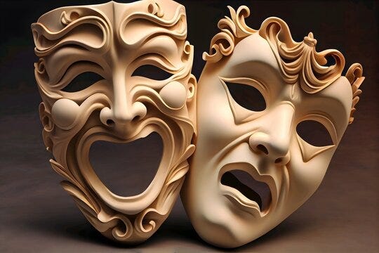 Símbolo de temas opostos na literatura, teatro e música, vem de duas das Musas Gregas, Melpomene e Thalia. Melpomene é a Musa da Tragédia, portanto, o rosto triste em uma máscara, enquanto Thalia é a Musa da Comédia, representada pelo rosto sorridente.