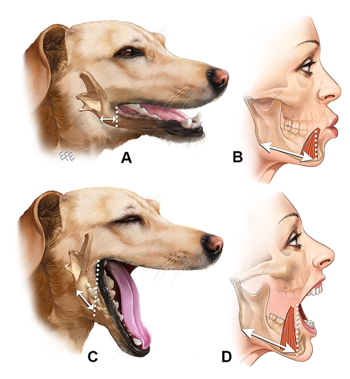 Esta ilustração comparando o humano ao cão mostra quanto tecido mole precisa deslizar sobre a mandíbula posterior à comissura oral para a mandíbula abrir. O humano tem uma boca muito estreita combinada com uma ampla fixação do músculo mimético (platisma, DLI, DAO). Essa combinação requer que a pele deslize sobre essa área (ou melhor, a mandíbula e as fixações musculares deslizam sob a pele), eventualmente criando o jowl.