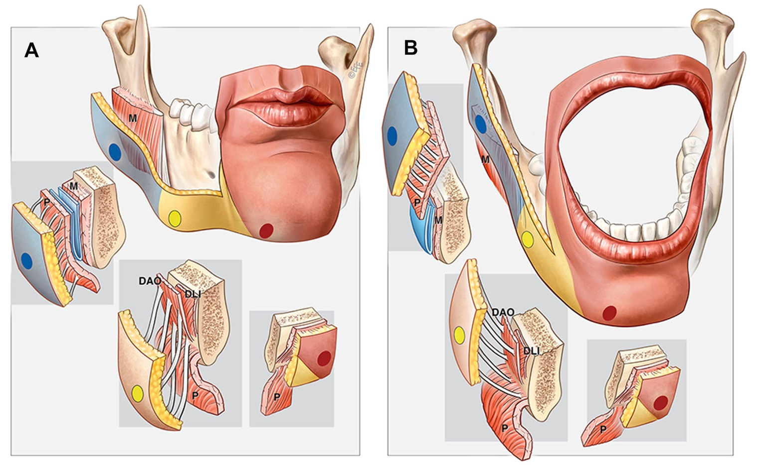 Esta ilustração demonstra como as diferentes áreas ao longo da mandíbula reagem à abertura da boca. No espaço pré-masseter (azul), a abertura da boca resulta no deslizamento do platisma sobre o masseter sem a necessidade de deslizamento adicional da pele. No septo mandibular (amarelo), a abertura da boca requer que a pele deslize sobre o complexo mandíbula-músculo na fixação mandibular comum do platisma, do músculo depressor do lábio inferior e do músculo depressor do ângulo da boca. Na zona de adesão perioral (vermelha), a abertura da boca resulta em movimento em bloco da mandíbula, músculos do lábio inferior e da pele, mantendo relações constantes.