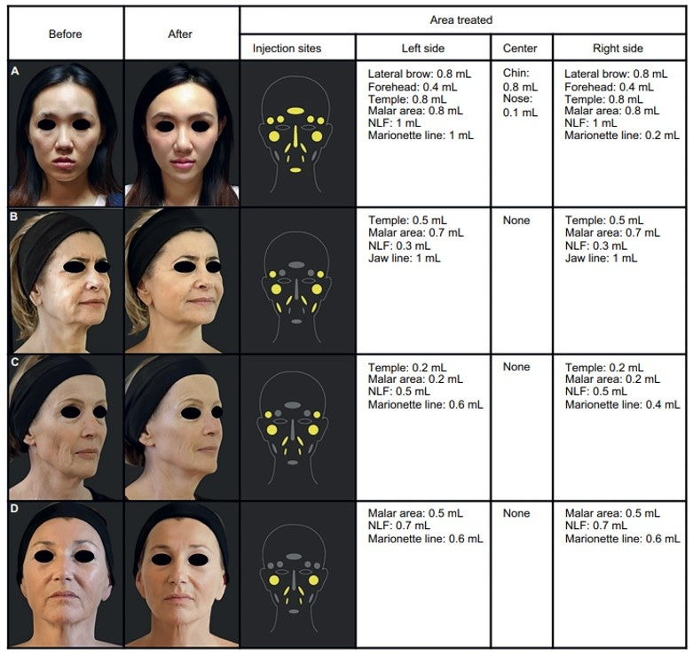 A hidroxiapatita de cálcio (CaHA) é uma opção eficaz de tratamento para muitas áreas de aumento de tecidos moles faciais e está associada a um perfil de segurança alto e bem estabelecido. O tratamento proporciona correção imediata que é gradualmente seguida pela formação de novo tecido por meio de neocolagênese, proliferação de células dérmicas, produção de elastina e angiogênese. Resulta em efeito estético duradouro com pele firme e elástica e aumento da espessura da pele (Rebellato et al., 2020).