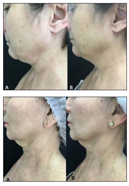 Rebellato et al. (2020) realizaram um estudo com 5 pacientes com região cervical envelhecida. Fotografias e biópsias foram realizadas antes do tratamento e 5 meses depois. O preenchedor foi injetado no plano subdérmico da região cervical anterior. As fotos foram analisadas por 10 dermatologistas e a satisfação do paciente foi questionada. Segundo os especialistas, houve redução do envelhecimento (p = 0,001), embora não tenha havido diferença entre os escores de satisfação dos pacientes (p = 0,576). A histologia mostrou que as fibras colágenas eram espessas e irregulares tanto no pré quanto no pós-tratamento, mas na maioria dos casos notamos fibras colágenas e elásticas mais compactas posteriormente, com novas áreas de horizontalização. A CaHA é eficaz na melhora da aparência e na bioestimulação do colágeno na região cervical.