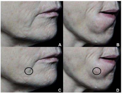 Chammas e Pereira (2022) apresentaram um caso clínico onde foi utilizada hidroxiapatita de cálcio (CaHA) diluída para melhora de cicatrizes no terço inferior da face provocada por acidente automobilístico. Paciente do sexo feminino, com 60 anos de idade, queixando-se de se incomodar com as cicatrizes no terço inferior da face. Para o caso em questão, foi proposta a aplicação de 3 sessões de CaHA, utilizando o Radiesse® diluído a 4 ml de soro fisiológico 0,9%. Para fim de comparação, foram realizadas fotografias padronizadas antes e depois do tratamento. Foram realizados vetores na região das cicatrizes e terço médio da face. A CaHA diluída foi aplicada com microcânulas 22G, aplicando-se a quantidade de 0,2 ml em cada vetor. Pode-se concluir que, após três sessões realizadas, foi possível verificar uma melhora das cicatrizes no terço inferior da face, na elasticidade e na firmeza da pele.