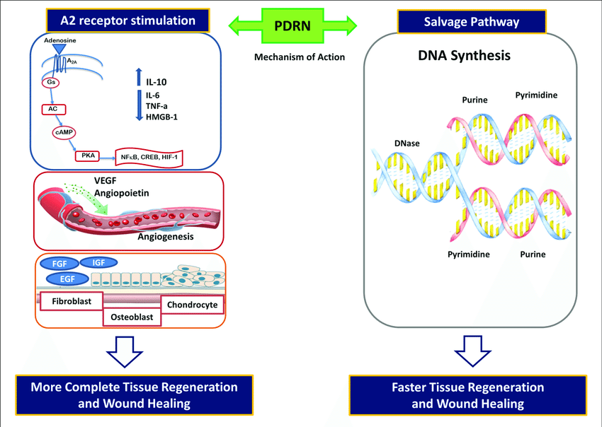 Estimulação da regeneração celular: Acredita-se que o PDRN ajuda a estimular a regeneração celular, o que pode ser útil na cicatrização de feridas e na reparação de tecidos danificados.