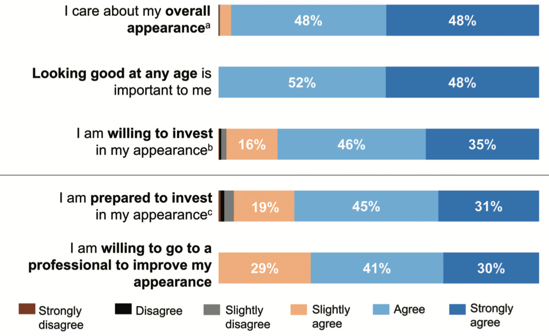 Diferenças regionais com base na localização geográfica foram observadas e podem ser exploradas em uma publicação futura. Os dados demográficos para os entrevistados da pesquisa esteticamente conscientes e médicos estão resumidos emTabelas 1ee2.2. Um total de 14.584 respondentes da pesquisa atenderam aos critérios de inclusão por serem esteticamente conscientes, conforme definido nos Métodos, com 100% concordando com “Boa aparência em qualquer idade é importante para mim” e “Estou disposto a ir a um profissional para melhorar minha aparência ” e >70% concordando ou concordando totalmente com as afirmações “Eu me importo com minha aparência geral”, “Estou disposto a investir em minha aparência” e/ou “Estou preparado para investir em minha aparência” (figura 1). A idade média (± desvio padrão [DP]) dos entrevistados esteticamente conscientes da pesquisa em geral foi de 41 (± 12) anos, com 41,8% dos entrevistados com idades entre 21 e 35 (“Millennial”; n = 6099), 42,0% com 36 a 55 anos (“Geração X”; n = 6.125), e 16,2% dos entrevistados com 56 anos ou mais (“Baby Boomer”; n = 2.360).