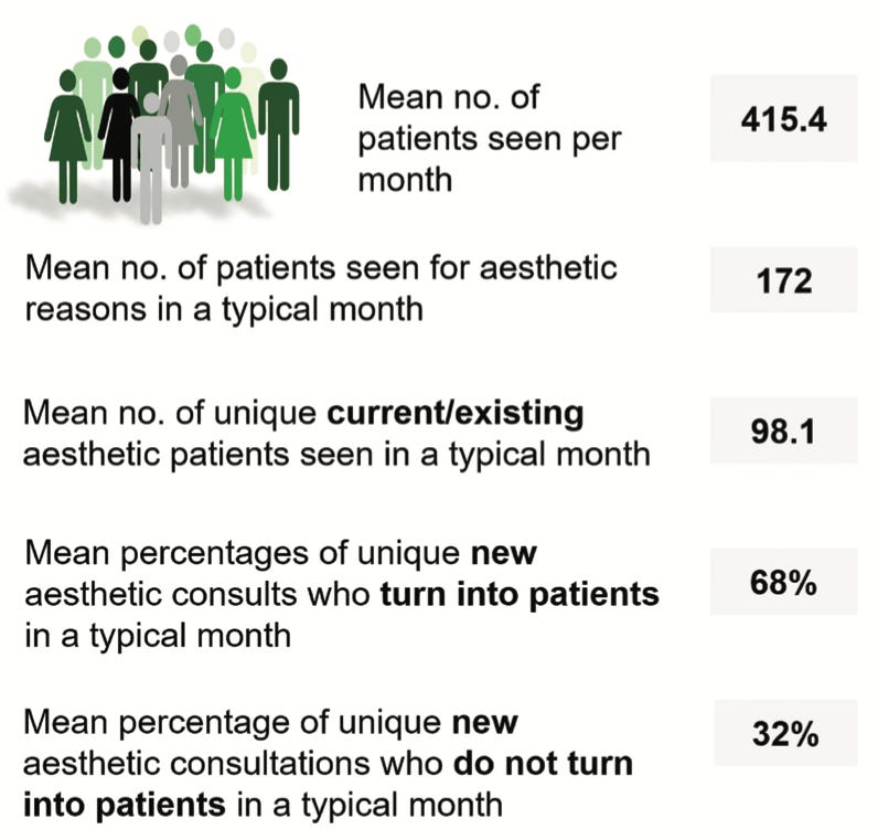 Médicos entrevistados: Os médicos entrevistados incluíram cirurgiões plásticos, dermatologistas e outros médicos focados em medicina estética. Os médicos elegíveis precisavam atender a critérios que incluíam atender ≥ 30 pacientes por mês por razões estéticas, ter de 2 a 30 anos de experiência na prática clínica e passar ≥ 70% de seu tempo no atendimento direto ao paciente. Análises de dados