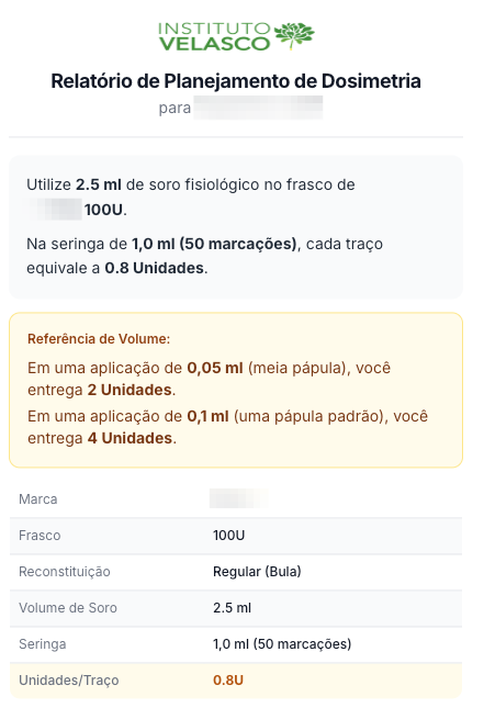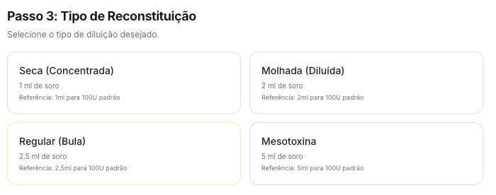Justamente por compreender que o consultório real é feito de múltiplas escolas e preferências que a calculadora não te obriga a mudar o seu fluxo de raciocínio. O sistema foi programado para abraçar a sua rotina: ao cruzar os dados da marca, do seu padrão de reconstituição (seca, regular ou molhada) e do volume da sua seringa, ele entrega o resultado final tanto em dose por pápula quanto em número de marcações (tracinhos).