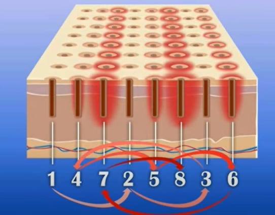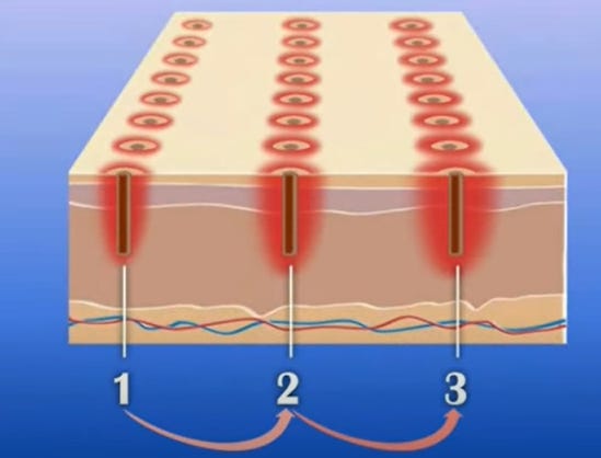 Ao penetrar na pele, atingindo a profundidade pré-determinada, as pontas das microagulhas transmitem a radiofrequência, que é convertida em energia térmica no tecido circundante. Através da RF convertida em calor, ocorre a quebra das ligações cruzadas da hélice tripla das fibras colágenas, causando encolhimento e espessamento da fibra, resultando no aumento da tensão da pele.
