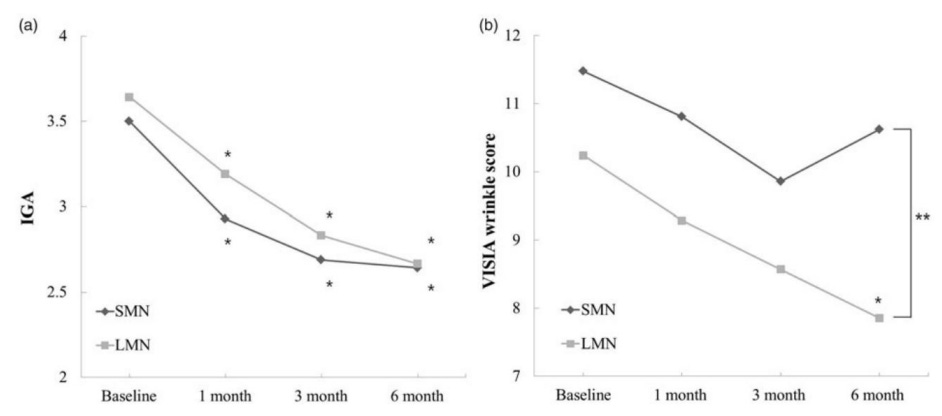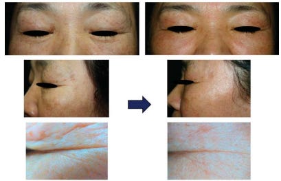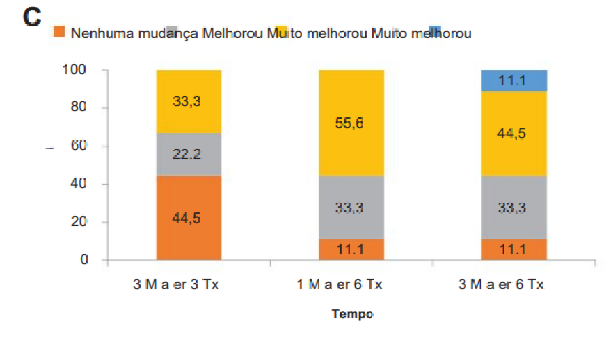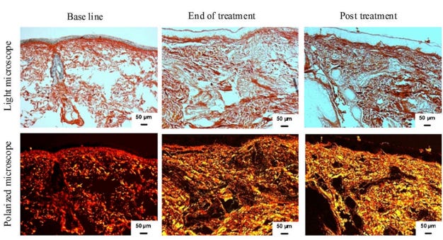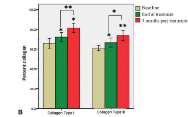 Segundo Moetaz e colaboradores, a resposta in vivo à cicatrização térmica de feridas consiste em 3 estágios consecutivos: inflamatório, proliferação e remodelação. Isso pode explicar porque os resultados clinicamente visíveis só foram alcançados entre 3 e 6 meses após o início do tratamento.