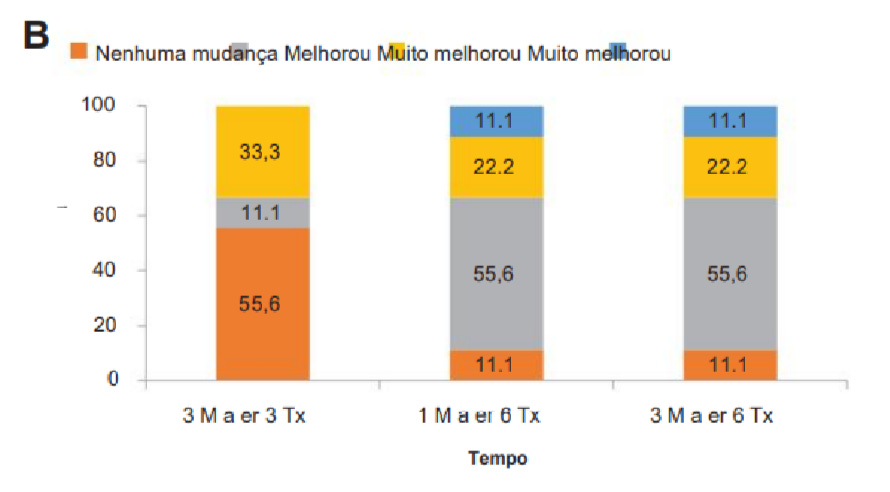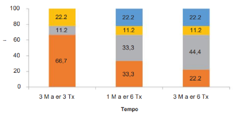 Os três primeiros tratamentos foram administrados em intervalos de 3 semanas, com visita de acompanhamento com 1 mês e 3 meses. Após 1 mês da segunda visita (aos 3 meses), foram iniciados mais 3 tratamentos com intervalos de 4 semanas, seguidos por outra visita de acompanhamento com 1 mês e 3 meses (Figura 11).