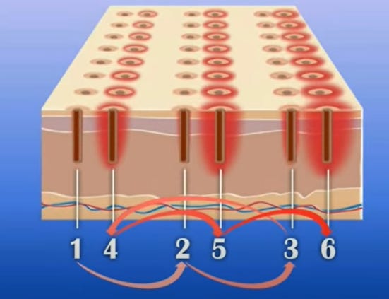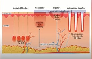 A tecnologia de radiofrequência (RF) fracionada é um método onde a energia térmica é gerada por meio de microagulhas isoladas ou não isoladas, que penetram a pele. Elas causam destruição parcial do tecido, criando zonas de microferidas intercaladas com áreas de pele íntegra. Essas áreas de pele saudável são as responsáveis pela regeneração e cascata de cura, promovendo a formação de novo colágeno, elastina e glicosaminoglicanas, resultando em melhor textura da pele, redução de rugas, firmeza e volumização. Ao contrário dos lasers não ablativos, os dispositivos de RF não dependem do cromóforo para eficácia ou segurança e, portanto, são adequados para todos os tipos de pele.
