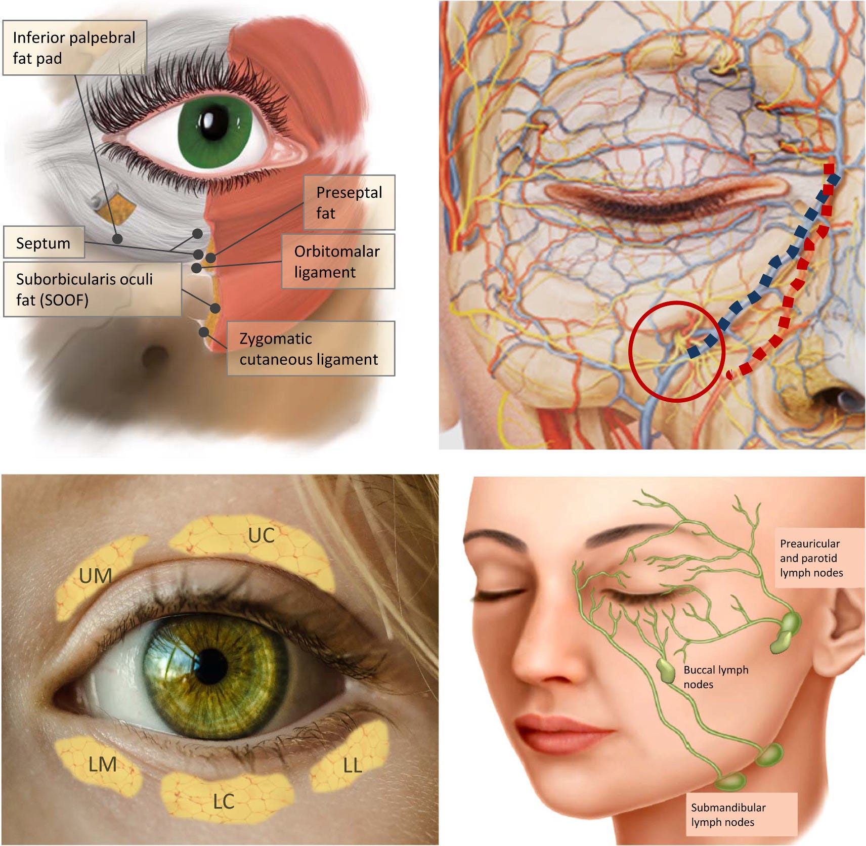 Estruturas anatômicas envolvidas na formação da deformidade em calha lacrimal. Este está localizado entre as áreas palpebral e orbital do músculo orbicularis oculi, e a localização da prega nasojugal corresponde ao limite inferior desse músculo. Superior esquerdo: Anatomia da área periocular. Superior direito: Imagem das estruturas vasculares e nervosas da área. A linha azul destaca a veia angular e a vermelha a artéria angular; o círculo vermelho indica a emergência do nervo infraorbitário. Inferior esquerdo: Localização das bolsas de gordura: medial superior (UM), central superior (UC), medial inferior (LM), central inferior (LC) e lateral inferior (LL). Embaixo à direita: drenagem linfática da área periocular. Referência da imagem.