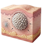 No que diz respeito aos processos de envelhecimento lento na pele e no tecido adiposo adjacente, existem três modificações morfológicas distintas no envelhecimento: uma redução moderada da espessura dérmica, uma expansão significativa do tecido adiposo branco dérmico (dWAT) localizado na interface entre a derme-subcutâneo e uma diminuição pronunciada do tecido adiposo branco subcutâneo (sWAT). A redução da espessura dérmica e a expansão simultânea do dWAT devem ser consideradas como processos recíprocos, uma vez que a derme e o dWAT apresentam duas camadas diferentes da mesma estrutura anatômica. Notavelmente, as camadas dWAT e sWAT demonstram comportamentos opostos no envelhecimento cronológico, o que pode estar, entre outras razões, ligado ao fato de que os adipócitos dérmicos que constituem o dWAT estão criticamente envolvidos na homeostase da pele e têm um fenótipo muito distinto que difere significativamente dos clássicos adipócitos brancos carregados de lipídios (Kruglikov,I.L., et al, 20215).