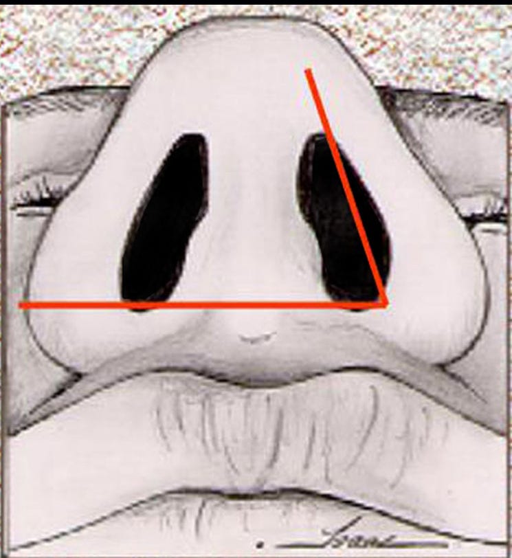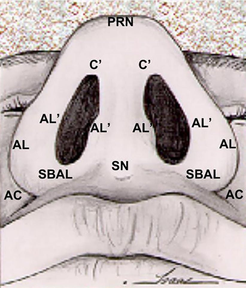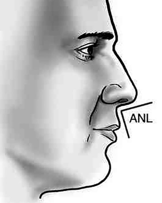 A columela se estende da ponta até o lábio, e sua inclinação está relacionada com o ângulo nasolabial (10). As narinas são classificadas conforme um ângulo formado entre a linha que cruza a base nasal e o maior eixo da narina (10).