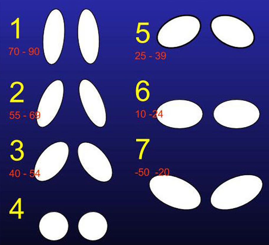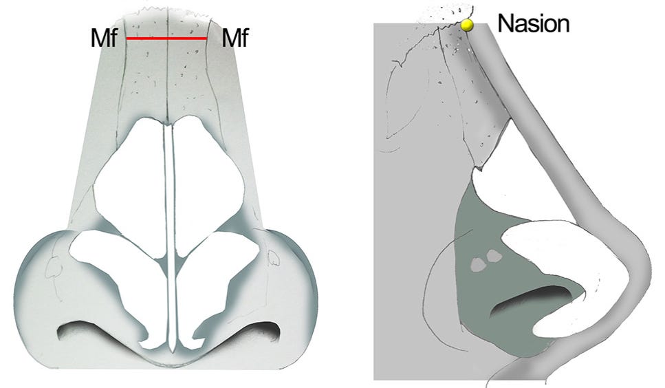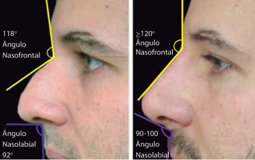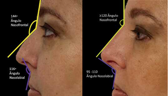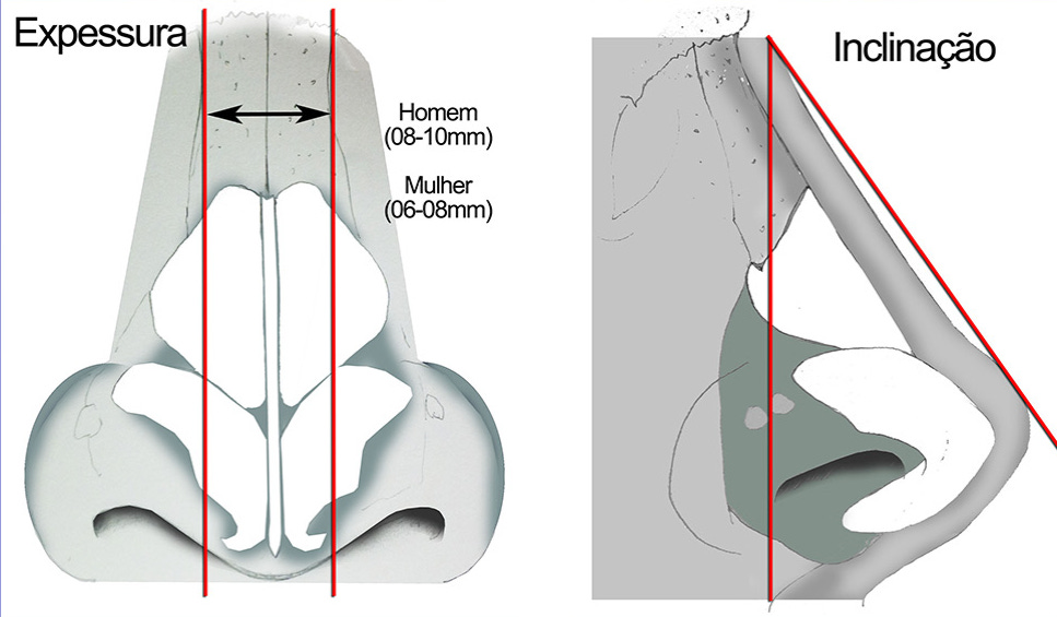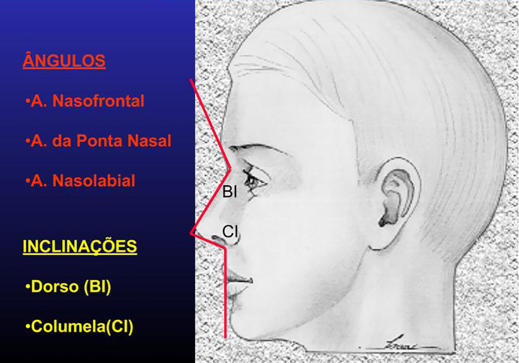 Existem 16 índices de proporção nasal que determinam comprimento, largura, inclinação e ângulos. Os ângulos utilizados são três: Nasofrontal, Nasolabial e Ângulo da Ponta Nasal (10).