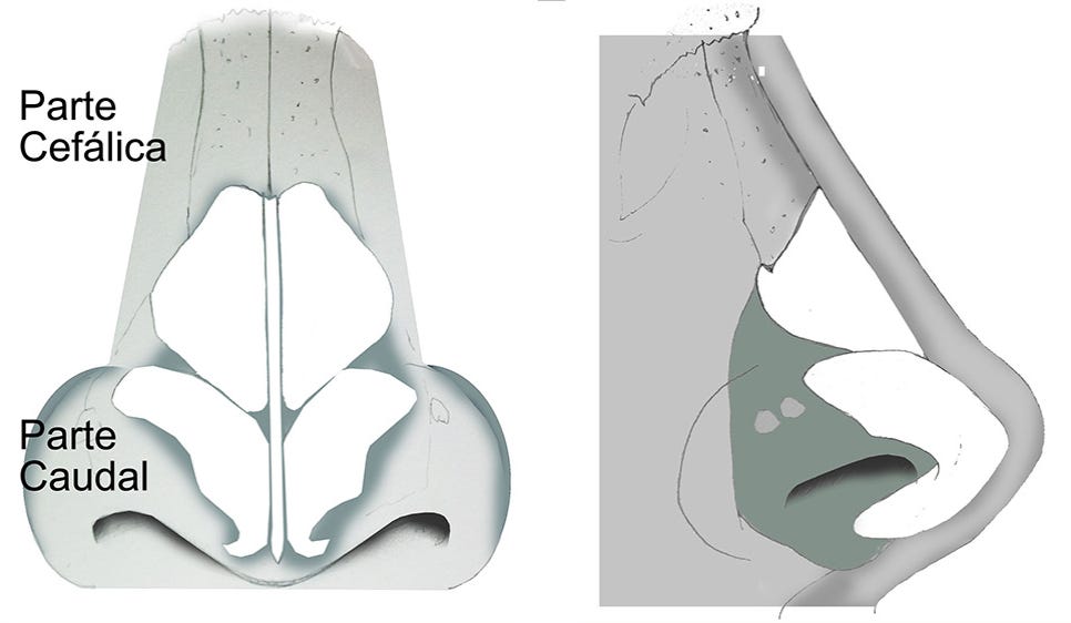 O nariz é dividido em parte cefálica (fixa, formada pela pirâmide óssea) e parte caudal (móvel, lóbulo). A raiz (násio) é a parte mais profunda, e sua altura varia entre caucasianos e negroides (10).