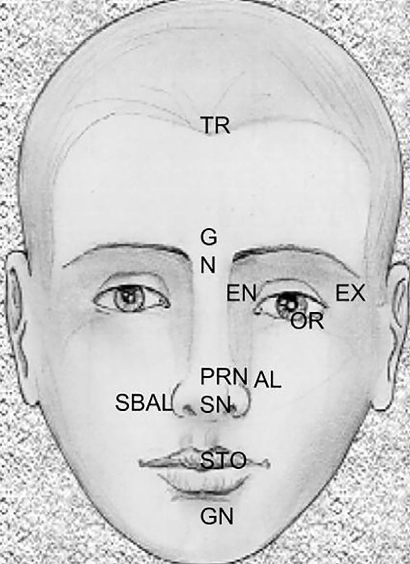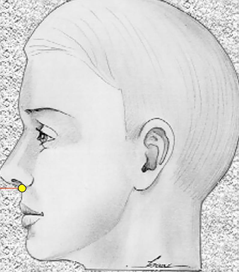 O Pronasal (PRN) é o local mais proeminente da ponta nasal. O Subnasal (SN) está localizado na junção columela-labial (10).