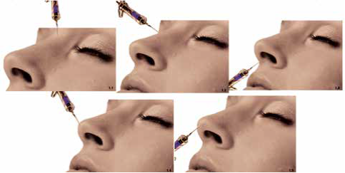 A duração dos preenchedores de AH em geral varia de seis a 24 meses (3). Na rinomodelação, são injetados de 0,6 a 2 ml em média total de AH. As modificações mais solicitadas são a elevação da ponta nasal, o aumento do ângulo nasolabial e a correção de irregularidades do dorso nasal (7).