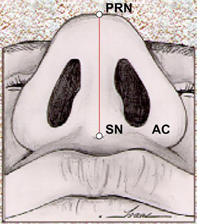 A projeção da ponta nasal pode ser medida pela distância entre a região pronasal (PRN) e a subnasal (SN) (10).