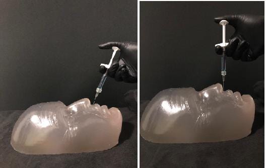 Com o paciente com a cabeça esticada, entrar com a cânula pelo mesmo pertuito e inclinar a cânula em direção à ponta nasal, encostar com cuidado e depositar 0,1 ml na região do TIP e descer pela columela, retroinjetando 0,2 ml de AH.