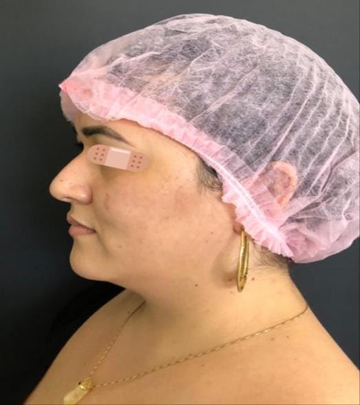 Paciente R.R.C., 32 anos, com queixa principal do nariz “caído”. Realizada a correção do dorso nasal e estruturas anexas com uso de ácido hialurônico e sutura columelar. A paciente assinou o TCLE e a liberação de imagens para estudo de caso clínico.