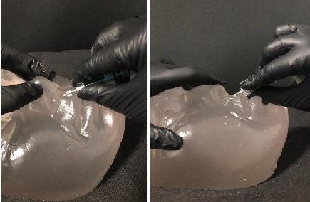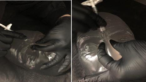 Na região no início do dorso, fazer outro pertuito e entrar com a cânula paralela ao dorso e retroinjeção de 0,1 ml de AH.
