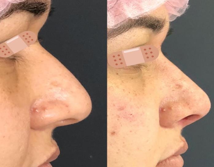 Foi realizado o procedimento de rinomodelação com 0,8 ml de ácido hialurônico Rennova Lifft com uso de cânula TAB 23G/30 mm e sutura columelar com fio Nylon BIOSUT 5.0.