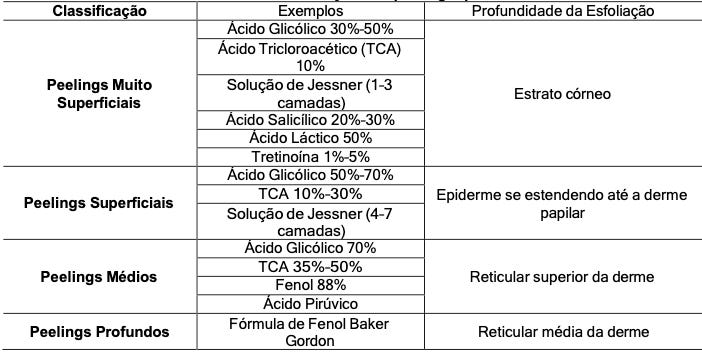 Na revisão de literatura realizada por Truchuelo et al. (2017)¹⁹, investigou-se o peeling químico. Este procedimento foi categorizado em superficiais, médios ou profundos, conforme seu nível de ação, destacando ácido glicólico, ácido mandélico e tretinoína como agentes considerados superficiais.