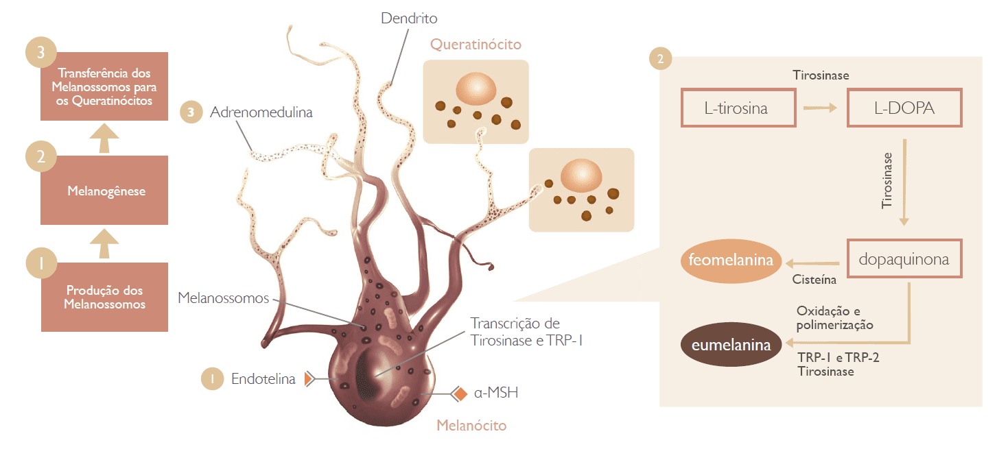 Há diversos mecanismos que podem vir a explicar o aumento da deposição de melanina. Um dos mais aceitos é que a radiação UV acarreta uma regulação positiva da estimulação dos melanócitos receptores hormonais (MSH), também denominados como receptores de melanocortina-1 (MC1-R), nos melanócitos, ocasionando uma maior ligação hormonal e, consequentemente, uma maior produção de melanina (BOLOGNIA et al., 1989).