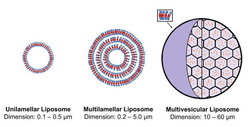 Os lipossomas podem ser unilamelares (uma única bicamada lipídica) ou multilamelares (várias camadas lipídicas concêntricas) e até mesmo multivesiculares. O que há de mais complexo em sua produção e uso envolvem a estabilidade em formulações, controle do tamanho e uniformidade, preservação a longo prazo e custo de produção. Tecnologias avançadas, como nanoliposomas e lipossomas funcionalizados, têm sido desenvolvidas para melhorar a eficiência desse sistema.